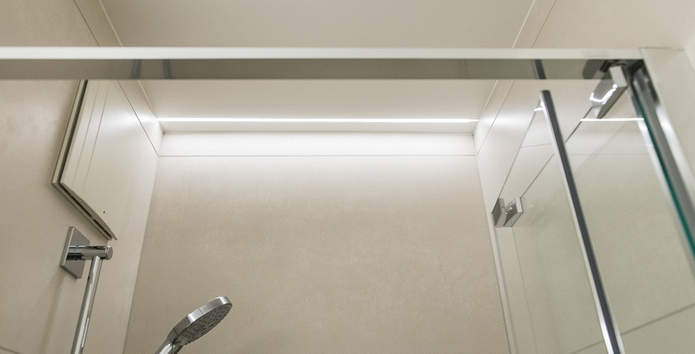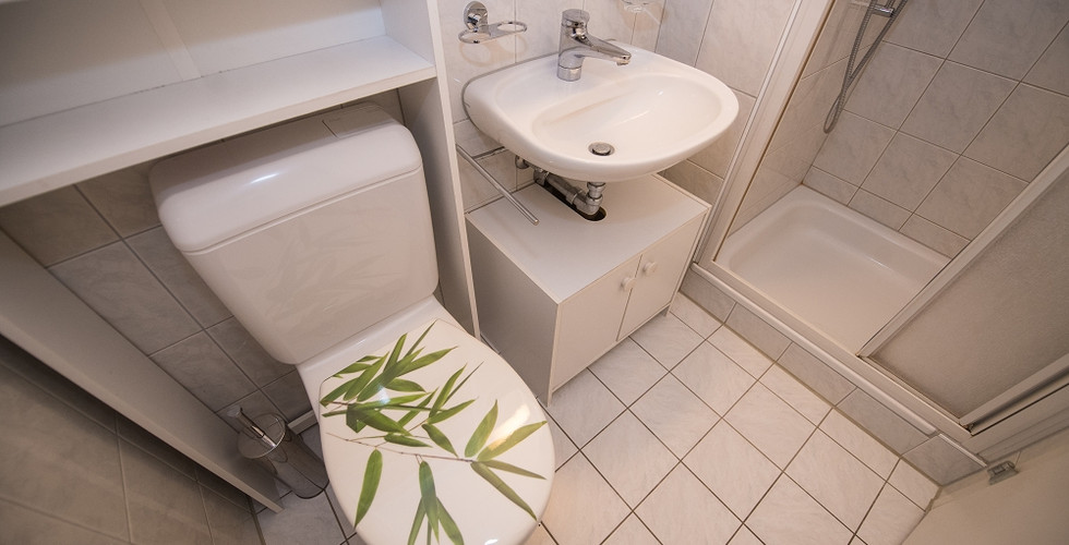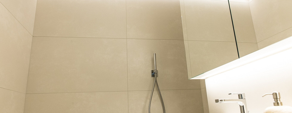 Die letzten Handgriffe bestehen im Montieren der Badmöbel inklusive Garnituren und dem Applizieren der Silikonfugen. Die Abdeckung des Raumventilators wurde erneuert und der Farbe der Wandplatten angepasst.