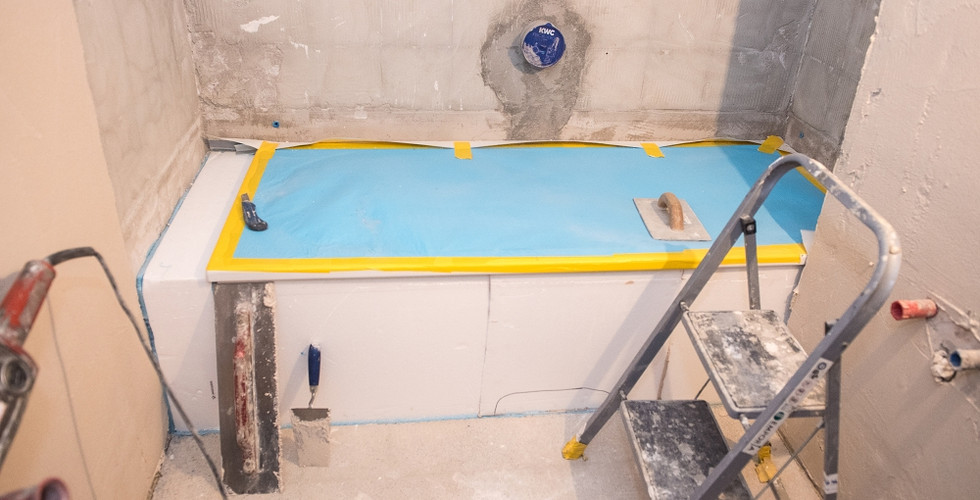 Nach der Übergabe der ersten Nasszelle an die Bauherrschaft, kann der zweite Teil des Umbaus in Angriff genommen werden. Auch hier werden zuerst sämtliche Demontagearbeiten ausgeführt, der Sockel mit Anschlüssen und Ablauf für die neue Badewanne vorbereitet und der Nassbereich abgedichtet, bevor der Plattenleger die grossflächigen Patten präzise anbringt.