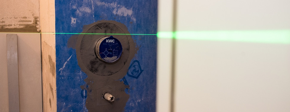 Nachdem die Arbeiten am Rohbau abgeschlossen sind, dichten Spezialisten den Nassbereich ab. Sie gewährleisten, dass sämtliches Wasser in den Ablauf gelangt und Wasserschäden vermieden werden. Auf dieser Basis beginnt der Plattenleger seine Arbeit. Mit Hilfe von Lasermessgeräten platziert er jede Platte exakt an der Wand.