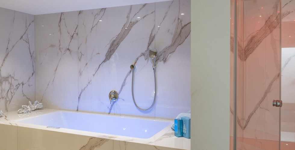Grossflächige Feinzeugsteinplatten und fugenlose Wandplatten unterstreichen die neue Raumstruktur. Die eingelassene Deckenbeleuchtung, schafft eine entspannende Atmosphäre. Im Bereich der Sauna kann nach Wunsch sogar die Farbe des Lichts individuell angepasst werden.