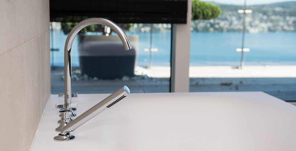Auch die Badewanne hat spezielle Masse. Sie ist exakt an die Trennwand, welche den Toilettenbereich abtrennt angepasst. Die Wannenrandarmatur unterstreicht dieses edle Design zusätzlich. In Kombination ergeben die beiden Möbel ein harmonisches und elegantes Bild.